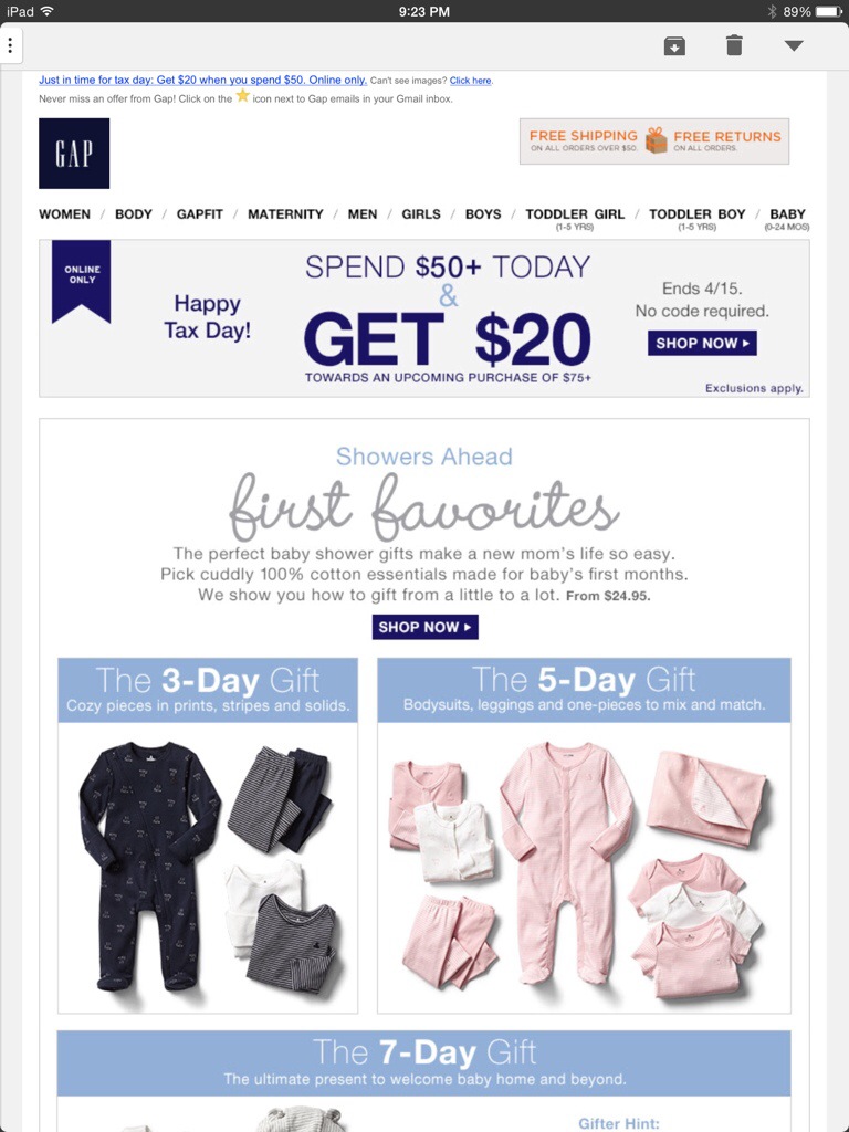 The Baby Gap email didn’t offer an immediate discount, but instead a $20 coupon to use later on a purchase of $75 or more if you make a purchase of $50 or more today. Wasn’t that confusing? Maybe they’re trying to recreate the feeling of doing your taxes, or they’re assuming that since you’ve just completed your taxes, you’re a pro at understanding weird wording.