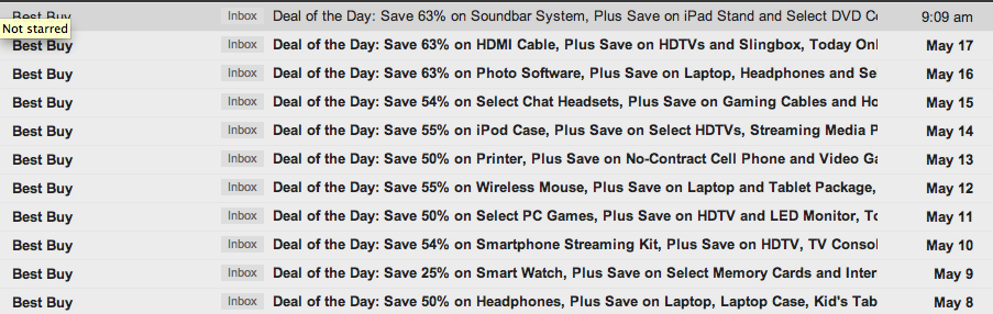 These emails feature a few products that happen to be on sale. The subject line is the same formula almost every day (but they did spice it up for Star Wars day), and the bottom of the email always has a “message clipped” note. For some of the deals, when you click on them, you can’t even see the “deal” price until you get to checkout. Best Buy? More like Best BYE.