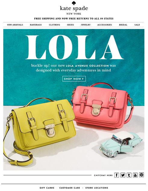 Continuing the theme of products named after women, Kate Spade sent this email about the new Lola Avenue Collection of bags. The pre-header text cut to the chase pretty quickly: our new lola avenue collection was designed with everyday adventures in mind. I love it when brands use song lyrics in subject lines, and I thought this was fun (even if it may have been a little obvious and expected.)