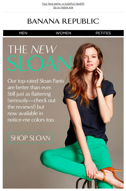 Oh, that Sloan. Sloan is a style of pants that Banana Republic sells. I’m not sure how many BR customers know that, but I don’t think it even matters, which is why this subject line works so well. For subscribers who were really familiar with that particular style of pants, they had reason to open the email – to see what updates/changes had been made to the pants. For people who had no idea who/what Sloan was, it was simply a really intriguing subject line, and the pre-header clued them in pretty quickly.