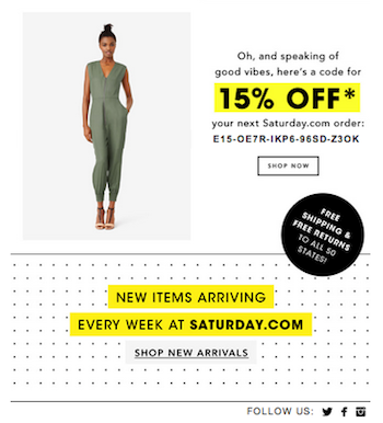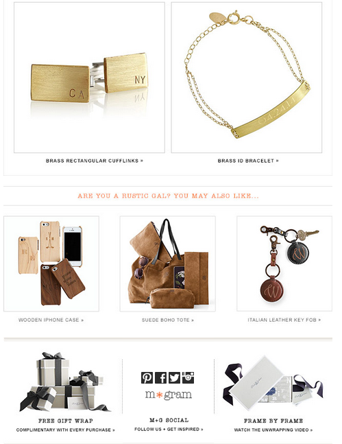 Another email that recently gave a little more than a sales pitch was from Mark & Graham, which sells a lot of monogrammed products (jewelry, bags, etc). This email featured jewelry designer Shelly Harper and some of her work. It gives their products a nice level of personalization (see what I did there? They sell MONOGRAMMED stuff!), and the jewelry they featured is delicate and nice.