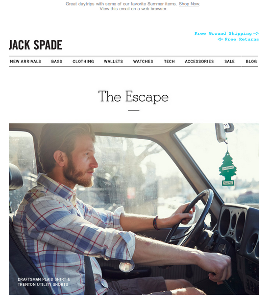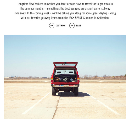 Jack Spade knows how to get people excited about summer. This email, sent on 4/16, introduced the brand’s summer collection in an interesting and creative way: with a summer road trip. It features large images of a guy driving on a sunny day, with a girl at his side and a Jack Spade bag in his trunk. It features products, but in a nice subtle way.